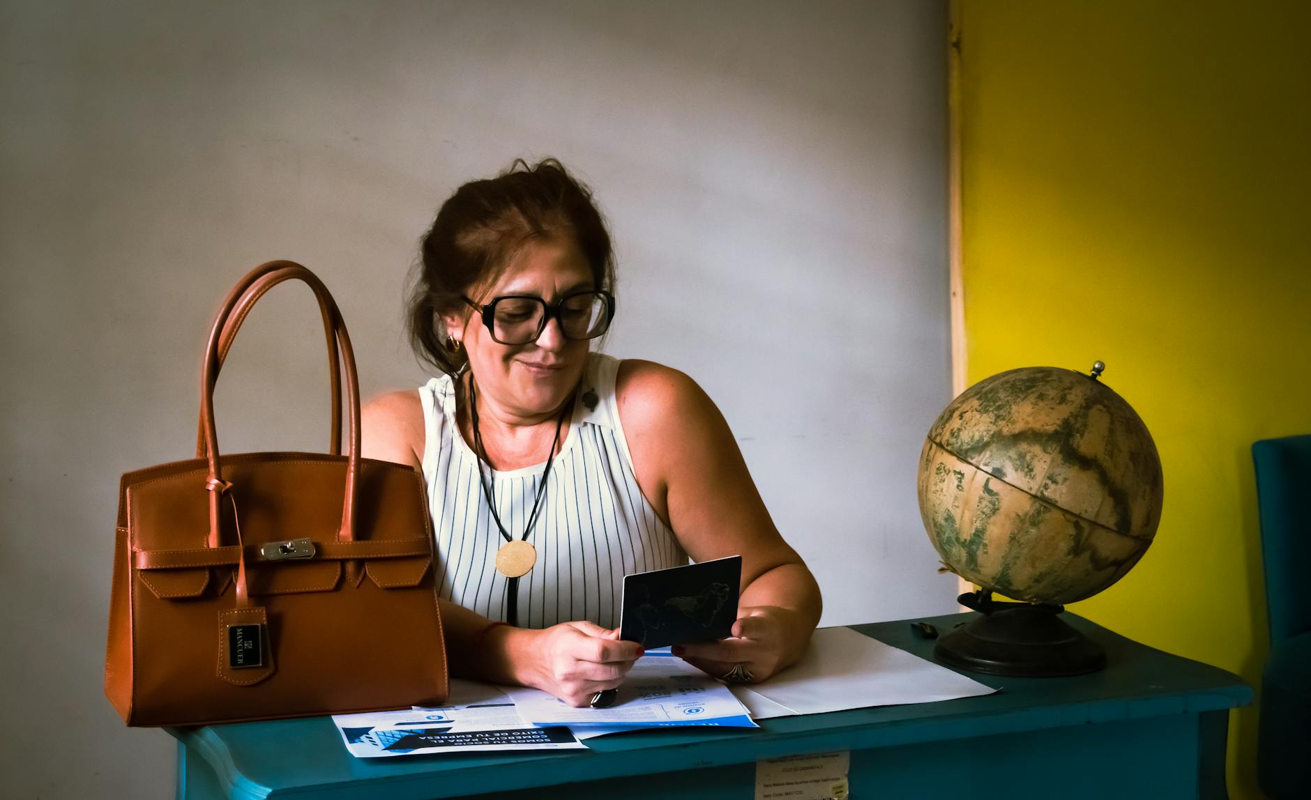 Kobieta przy biurku z torebką, dokumentami i globusem w biurze
